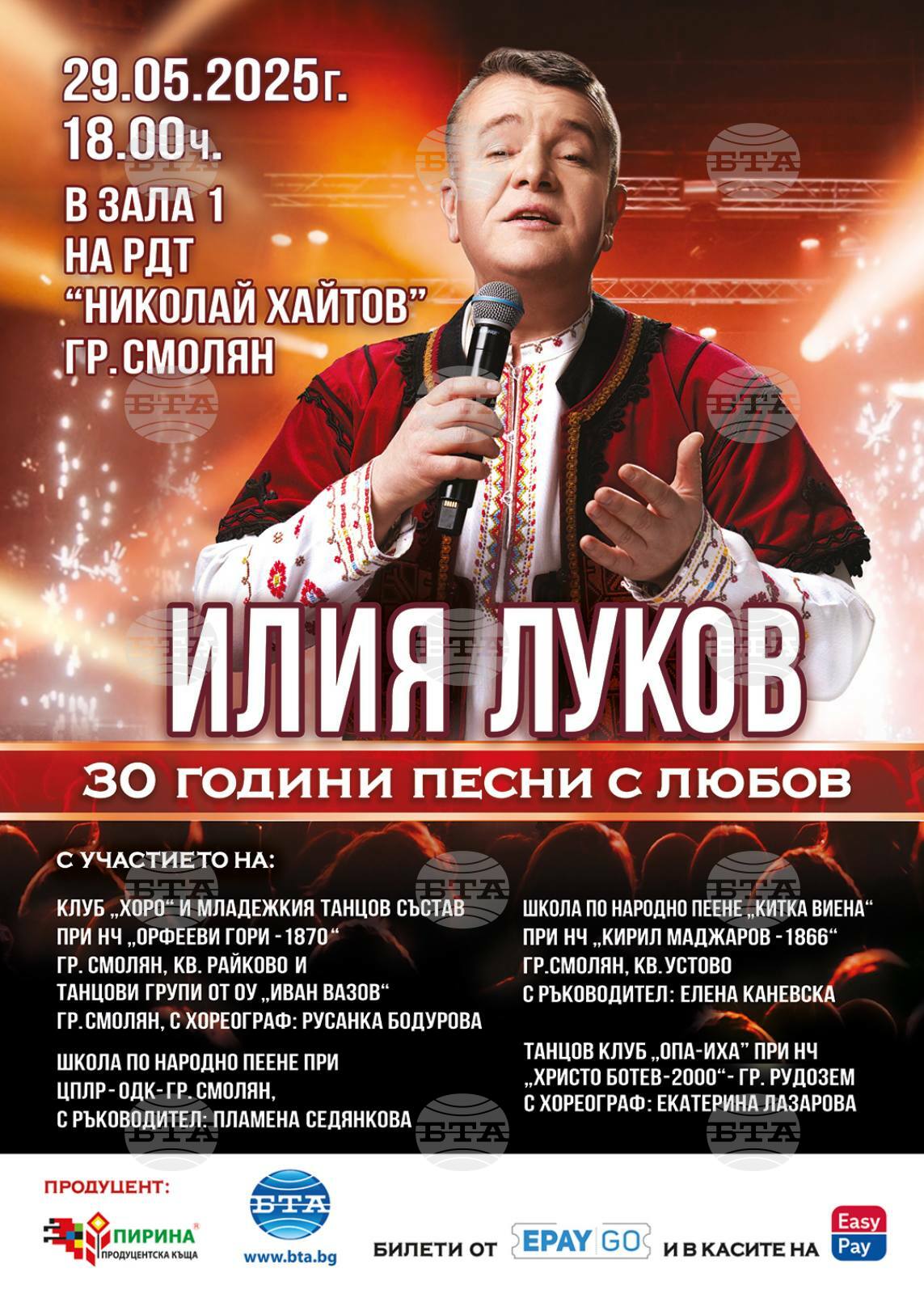 Спектакълът на Илия Луков пред смолянска публика ще бъде с участието на клуб „Хоро“ и младежки танцов състав при читалище „Орфееви гори“ в Смолян. Танцьорите от клуб „Хоро“ ще участват с хореографии на 5 песни на известния певец и ще изиграят добруджански танц, обясни Русанка Бодурова, хореограф на клуба.
