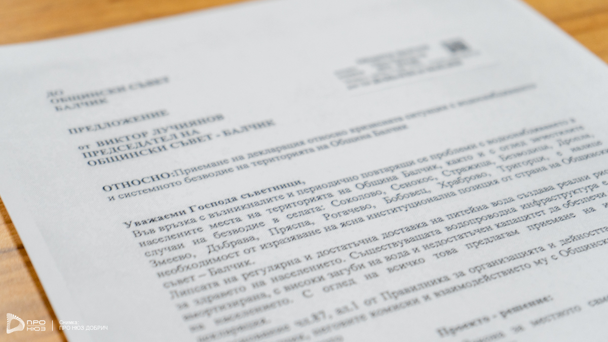 Общински съвет – Балчик изразява своята сериозна загриженост във връзка с продължаващите проблеми с водоснабдяването и случаите на безводие. Достъпът до питейна вода е неотменимо право и неговата липса създава реален риск за здравето, икономиката и нормалния живот на гражданите ни. В някои населени места на община Балчик водоснабдяването липсва в продължение на 20 дни, което поставя жителите им в критично и недопустимо положение. Общинският съвет подчертава, че многократно е търсил съдействие от ръководството на „ВиК – Добрич“ АД, но представителите на дружеството системно игнорират тези усилия и вече дори не приемат поканите за среща за решаване на проблемите. Общинският съвет изразява пълна подкрепа към гражданите и споделя тяхното основателно недоволство от липсата на адекватно водоснабдяване.