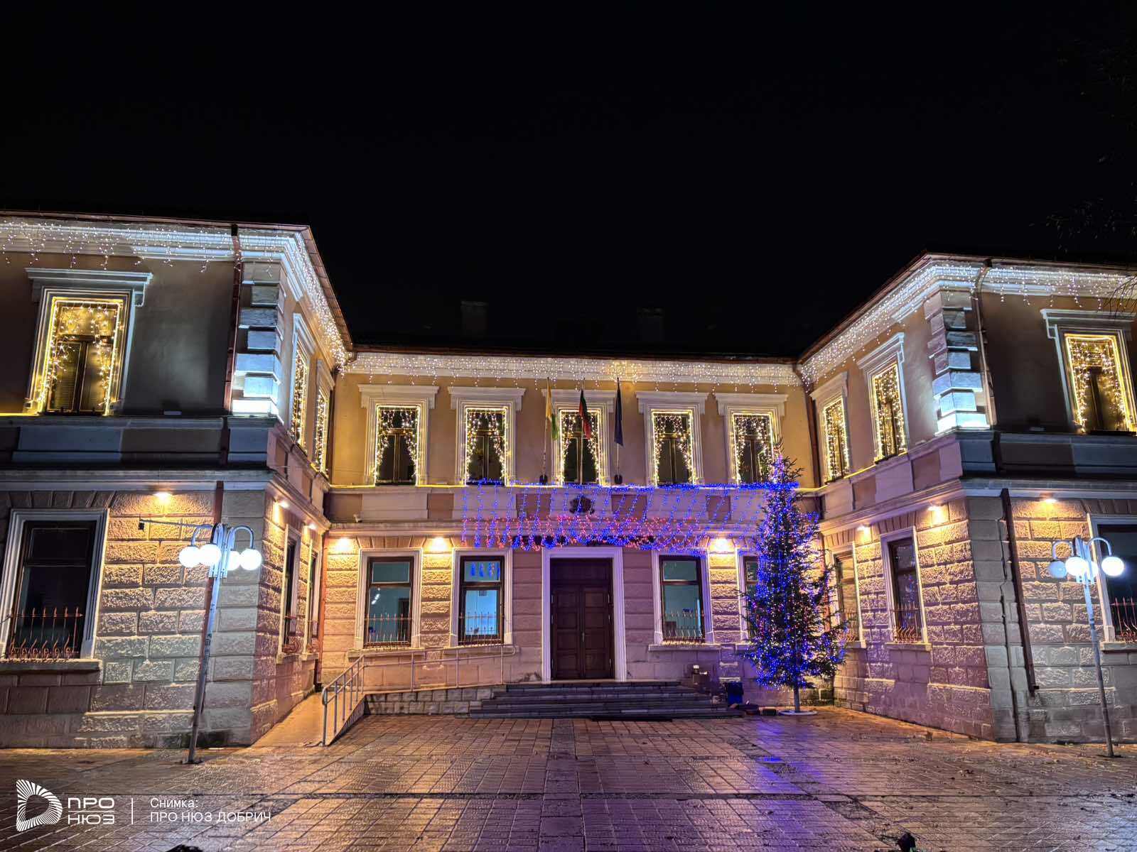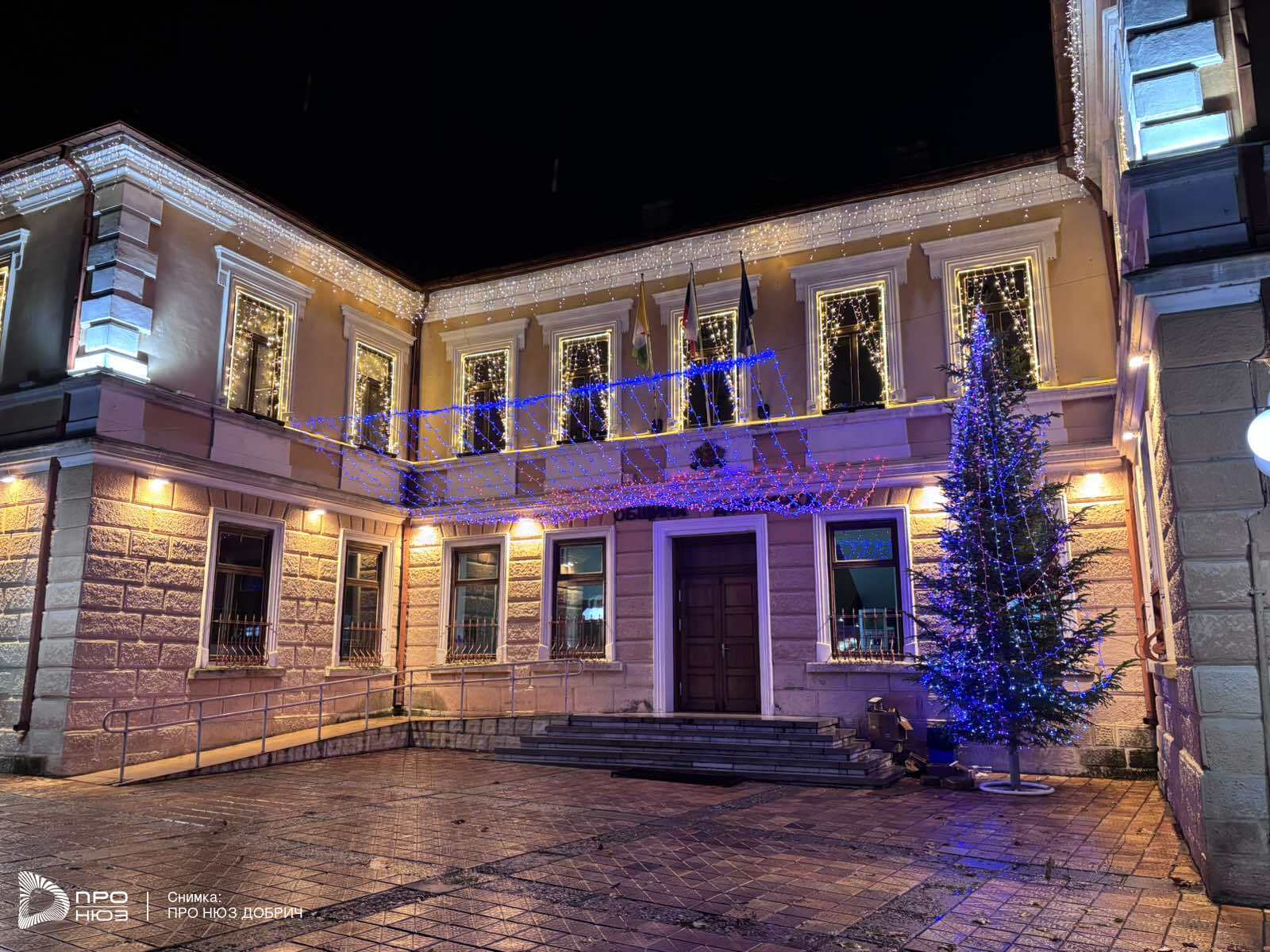 Сред украсените обществени сгради впечатлява Община Добричка. Нежни фасадни светлини, приглушена коледна атмосфера, елха пред входа. Има и частни обекти, които впечатлявмат с празничните си светлини.