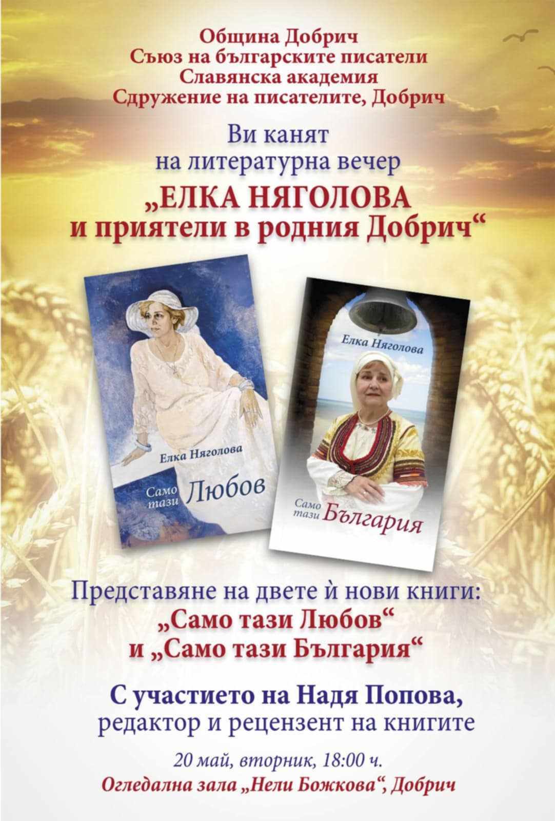 Добрич ще бъде домакин на специална литературна вечер, посветена на творчеството на Елка Няголова. Събитието, озаглавено "Елка Няголова и приятели в родния Добрич", ще се проведе на 20 май (вторник) от 18:00 часа в Огледална зала "Нели Божкова".