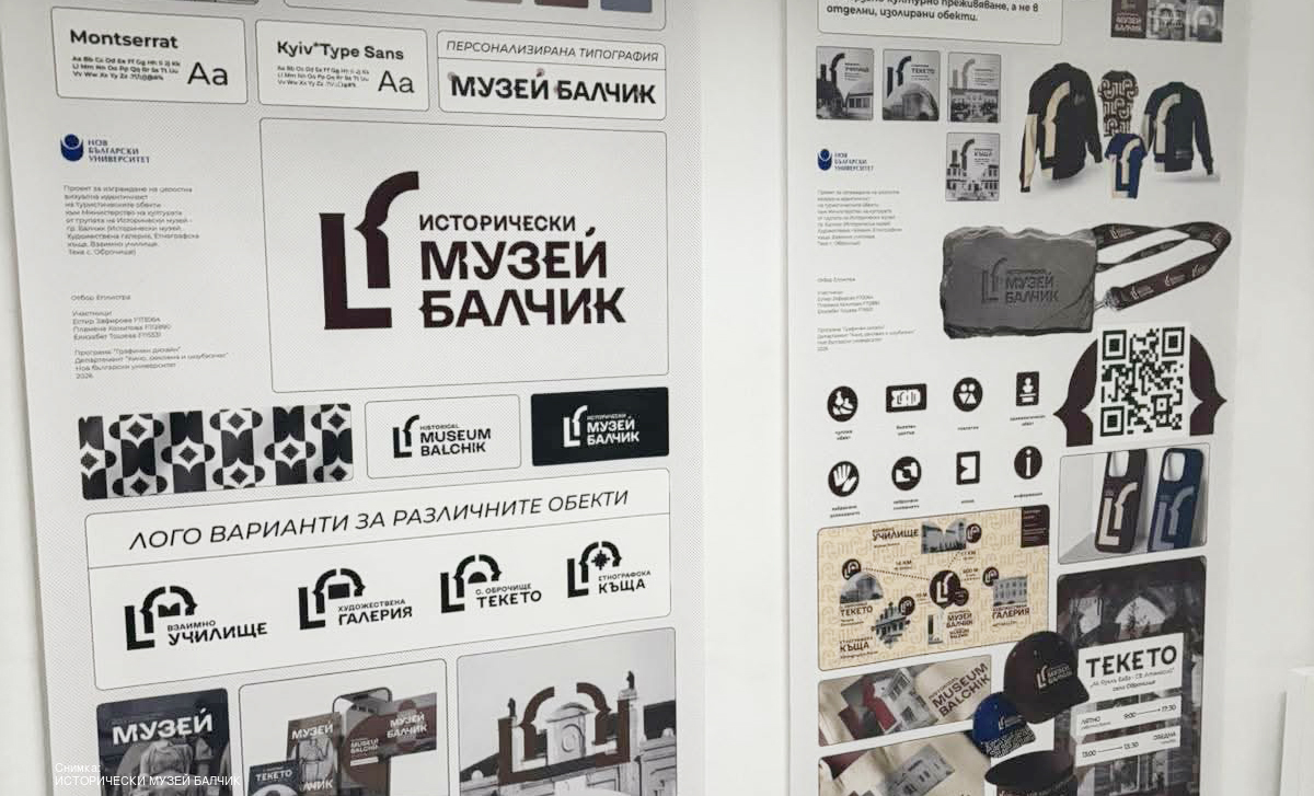 В Нов български университет беше открита изложба на финалистите в конкурса за изграждане на цялостна визуална идентичност на туристическите обекти от групата на Исторически музей – Балчик. Събитието събра млади творци – студенти от бакалавърската програма „Графичен дизайн“ към Департамент „Кино, реклама и шоубизнес“, които представиха своите концепции за модерно и разпознаваемо визуално присъствие на музейните обекти. Куратор на изложбата беше гл. ас. д-р Захарина Петрова-Проданова, а в ролята на модератори се включиха доц. д-р Илия Кожухаров, гл. ас. д-р Мария Койчева, гл. ас. д-р Стоян Манчоров и ас. Иван Гинев. Те насочиха дискусията към значението на визуалната идентичност за съхраняването и популяризирането на културното наследство, както и към ролята на съвременния дизайн в изграждането на привлекателен туристически образ. Изложбата представи разнообразни идейни решения, които търсят баланс между историческата автентичност и съвременния визуален език – ключов елемент за развитието на културния туризъм в региона. Жителите и гостите на Балчик ще имат възможност да видят изложбата на 16 май, когато тя ще бъде част от инициативата Нощ на музеите.