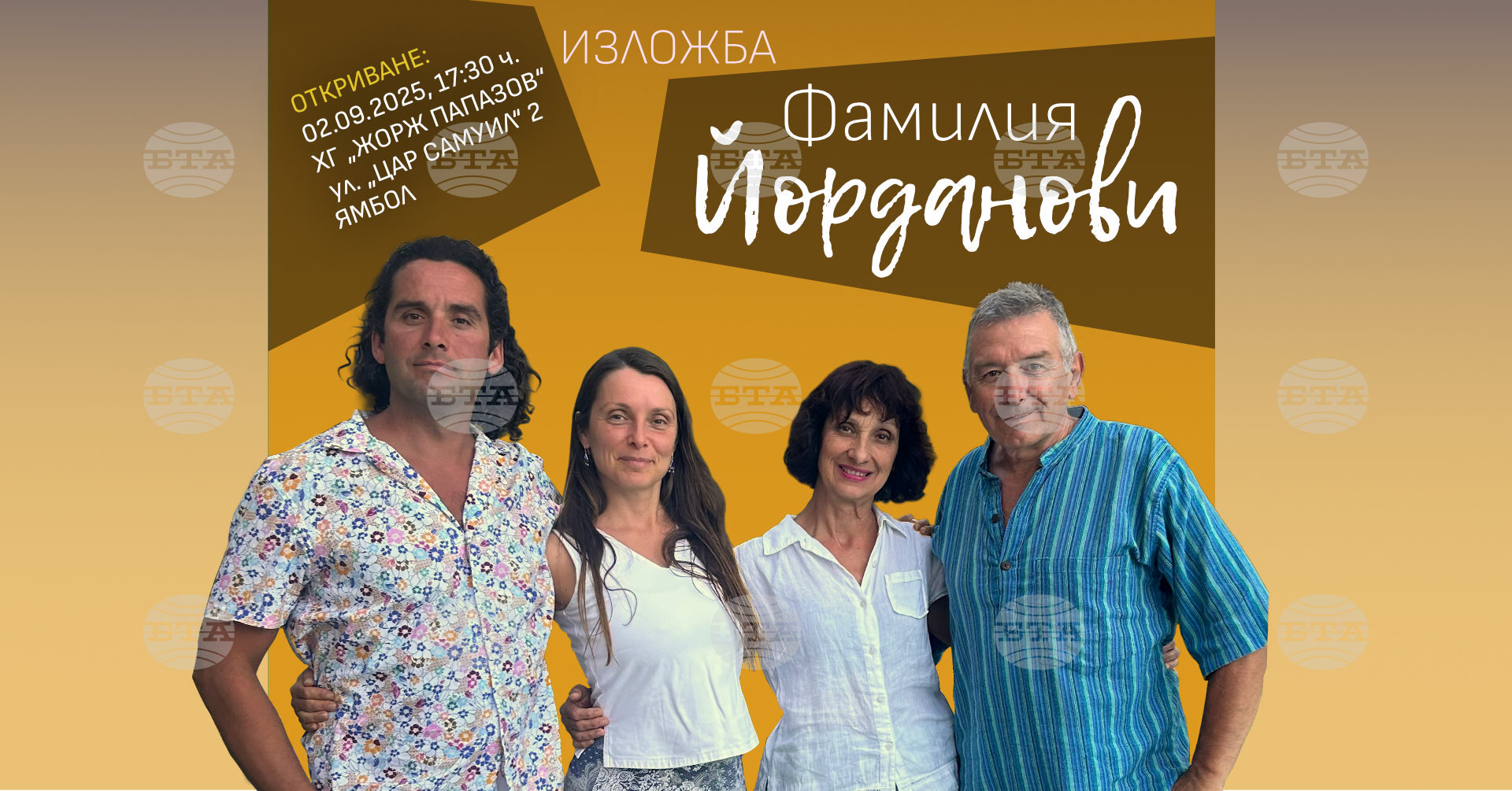 Скулптурни и живописни творби ще представят в колективна изложба баща и син, майка и дъщеря от артистичната фамилия Йорданови в Ямбол. За събитието съобщи в социалните мрежи скулпторът Петко Йорданов. Произведения на четиримата ще бъдат експонирани на 2 септември в Художествена галерия (ХГ) „Жорж Папазов“ в Ямбол.