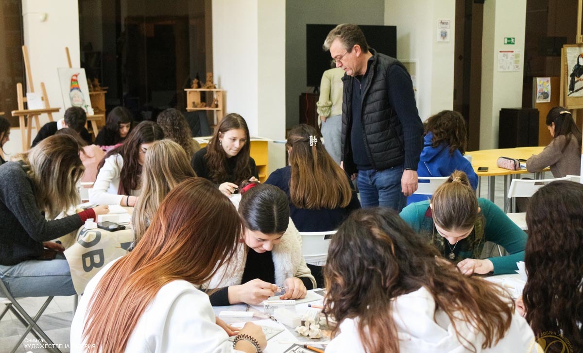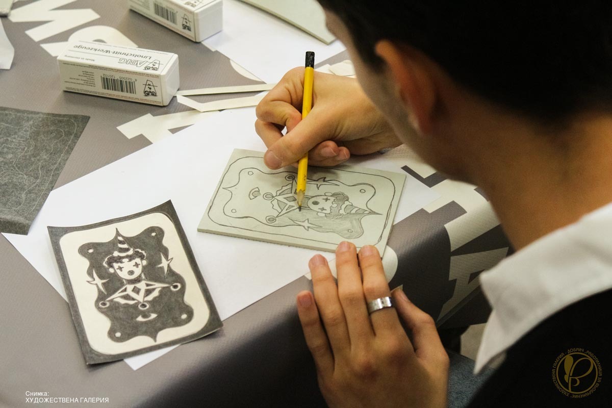 В рамките на „Работилница за въображение“ се проведе творческо занимание с ученици от 12 клас, паралелка „Графичен дизайн“ при СУ „Климент Охридски“ – Добрич. Срещата беше посветена на техниката гравиране върху линолеум и се реализира като продължение на дейностите по проект „Графични диалози“ на Художествена галерия – Добрич.
