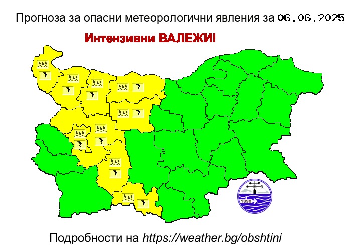 Жълт код за девет области в Западна България за локални интензивни валежи, гръмотевични бури и за градушки издаде за днес НИМХ